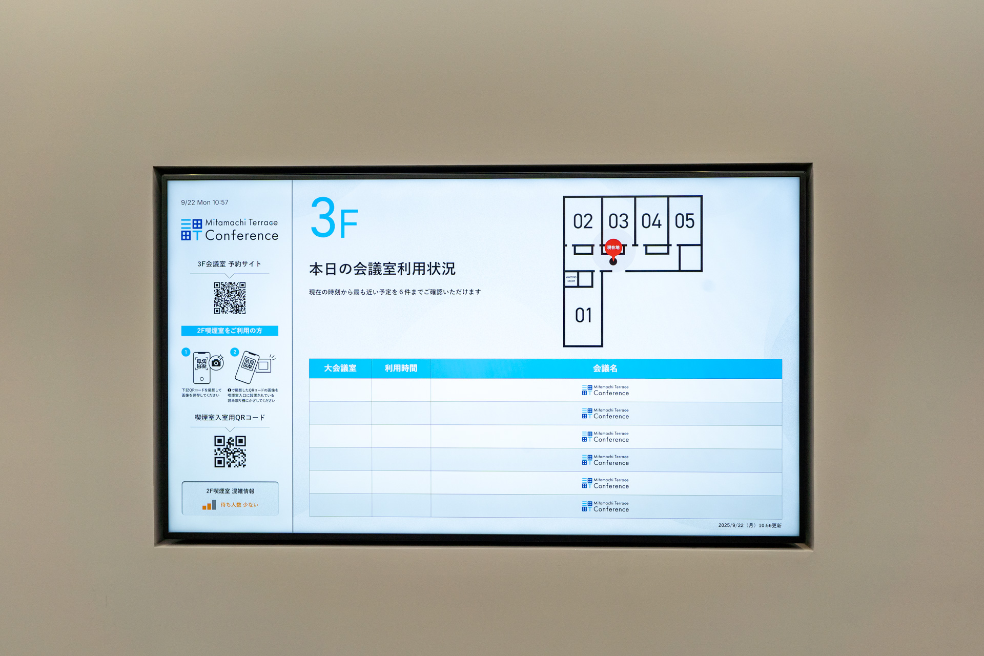 予約は専用サイトから。利用状況は館内のサイネージで確認できます。さすが最新のオフィス。