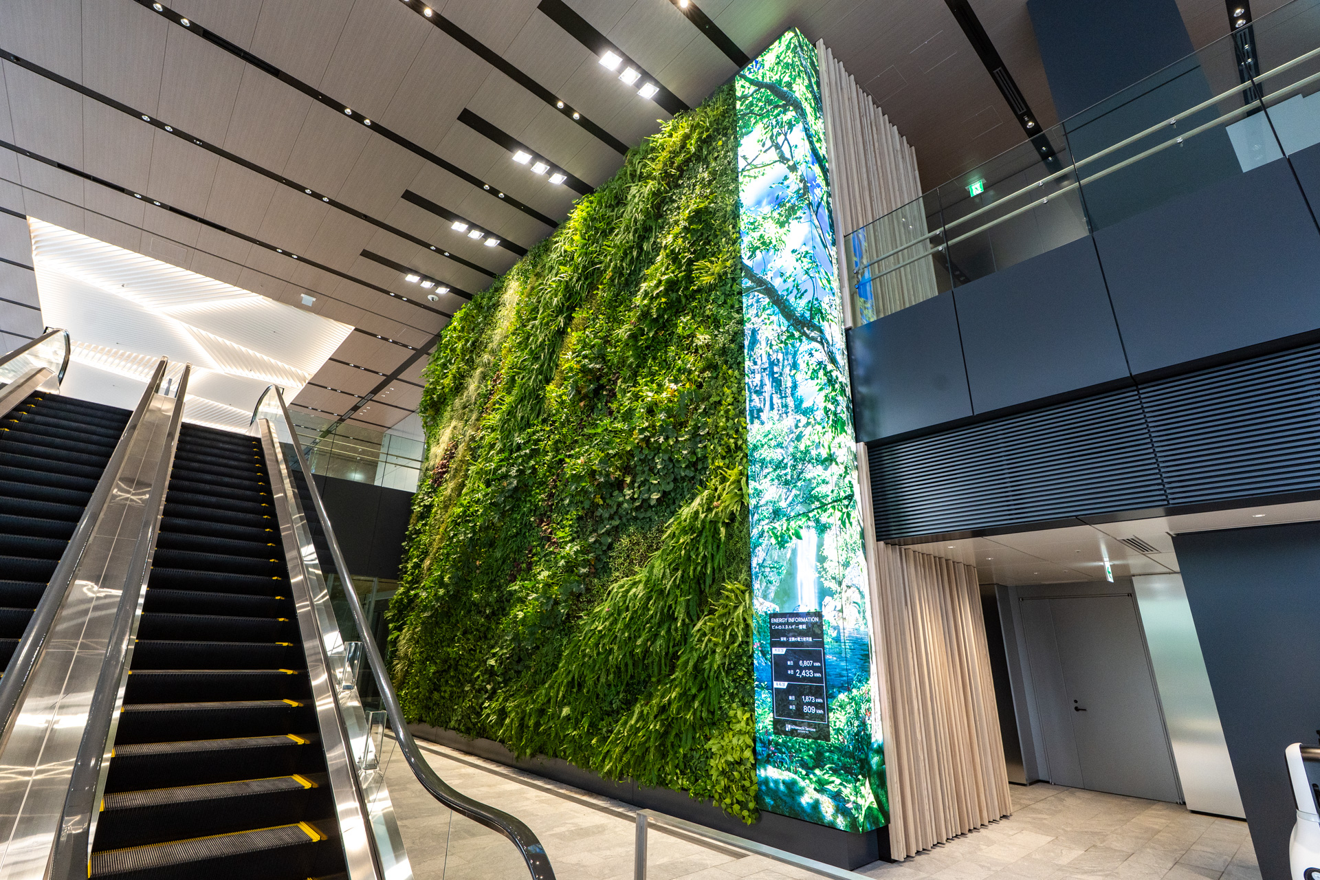 館内に入ってすぐ目を引くのは、高さ9.5メートルもの巨大サイネージ。四季や天気などと連動して映像が変わるので、訪れるたびに違う表情を楽しめます。さらに壁面のかなり広いスペースが植物で覆われていて(しかもその多くが本物!)、インパクト大。やっぱり植物があると心地良いですよね〜。